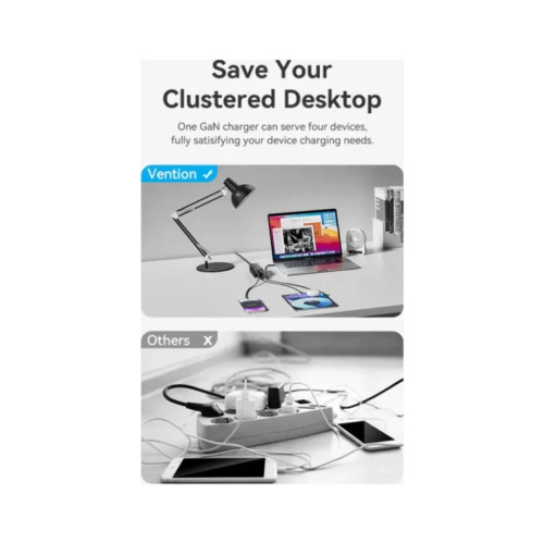 Vention FBSBG-EU допоможе вам одночасно зарядити чотири пристрої. У такому випадку порти USB Type-C1/C2 працюватимуть з максимальною потужністю 60 Вт та 20 Вт, а порти USB Type-А – з потужністю до 5 В - 3 А.