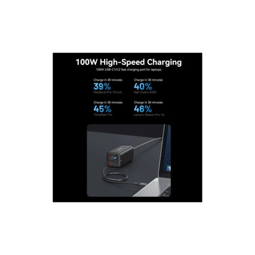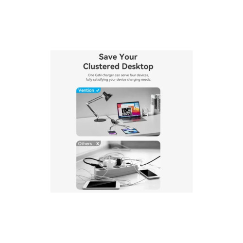 Завдяки використанню нітрида галлія (GaN) зарядний пристрій може надавати максимальну потужність без перегріву й водночас залишатися компактним. Пристрій оснащений двома роз’ємами USB Type-C та двома USB Type-A. Це робить його універсальним. За допомогою Vention 4-Port можна заряджати як смартфони й планшети, так і ноутбуки.