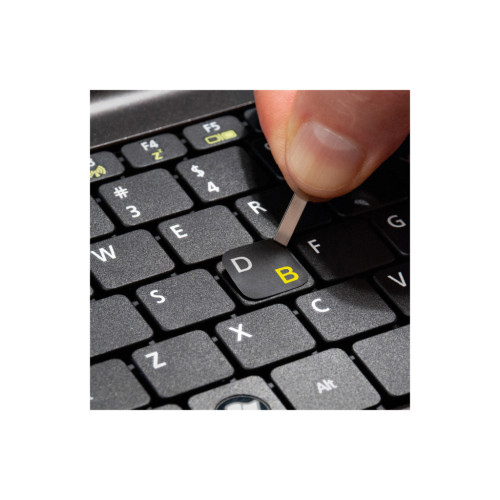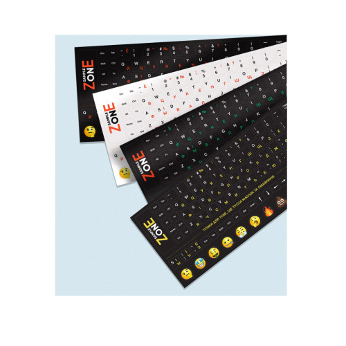 Наклейки на клавіатуру, непрозорі чорні, біло-жовті букви. Виготовленні за спеціальною технологією, яка запобігає стиранню букв. Має приємну на дотик поверхню, при наклеюванні схожі з пластиковою поверхнею клавіатури. Високоякісний ультрафіолетовий друк забезпечує чітке відображення розкладки клавіатури. Не стираються і не змінюють форму при довго тривалому використанні. Має додатковий комплект букв та смайликів. Розкладка: російська/українська/англійська