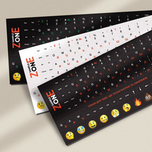 Виготовленні за спеціальною технологією, яка запобігає стиранню букв. Має приємну на дотик поверхню, при наклеюванні схожі з пластиковою поверхнею клавіатури. Високоякісний ультрафіолетовий друк забезпечує чітке відображення розкладки клавіатури. Не стираються і не змінюють форму при довго тривалому використанні. Має додатковий комплект букв та смайликів. Розкладка: російська/українська