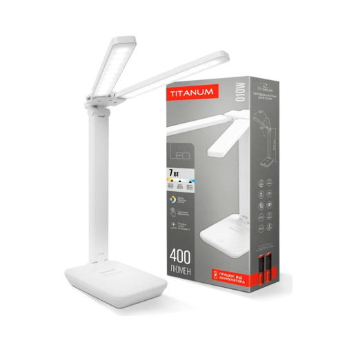 Світлодіодна настільна лампа з акумулятором TITANUM TLTF-010W - стильна та економічна з можливістю регулювання яскравості та колірності. Лампа абсолютно безшумна, компактна та має тривалий термін служби. Корпус виготовлений з екологічно безпечного високоякісного пластику білого кольору. Зовнішнє покриття корпусу імітує шкіру, що також додає лампі більший захист від подряпин. Пристосована для розміщення на робочому столі та призначена для його освітлення. Рухома конструкція лампи дозволяє скеровувати світло у потрібному напрямку. А особливістю лампи є те, що верхня частина корпусу лампи розділена на дві частини і це дозволяє ще більше підлаштовувати її під власні потреби. Реалізована можливість регулювання яскравості та зміни колірності світла, що сприяє зменшенню навантаження на органи зору в різних умовах та під час різних видів діяльності. Слугує також в якості підставки для смартфона, на корпусі для цього є спеціально відведене місце з бортиком.