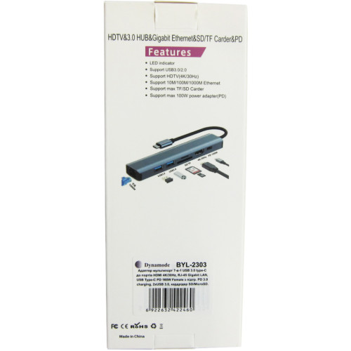Концентратор Dynamode 7-in-1 USB-C to HDTV 4K/30Hz, 2хUSB3.0, RJ45, USB-C PD 100W, SD/MicroSD (BYL-2303)