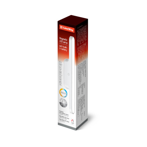 Світлодіодна лампа ColorWay з акумулятором оснащена магнітним кріпленням, що робить її надзвичайно зручною у використанні. Це кріплення дозволяє швидко і легко встановлювати лампу в будь-якому місці та регулювати її кут нахилу для досягнення оптимального освітлення. Магнітне кріплення забезпечує надійну фіксацію та легкість у демонтажу для перенесення або заряджання без використання інструментів. Акумулятор ємністю 1800 мАг забезпечує до 10 годин безперервної роботи. Три температурні режими світла та плавне регулювання яскравості дозволяють налаштувати освітлення відповідно до ваших потреб. Пам'ять налаштувань яскравості і сенсорна кнопка для безшумного управління забезпечують додаткову зручність у користуванні.
