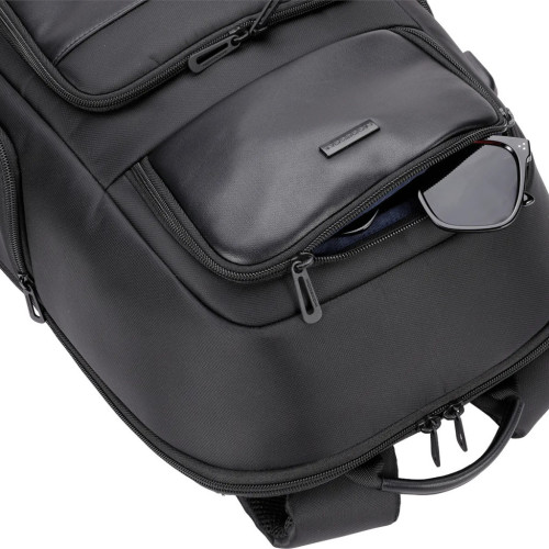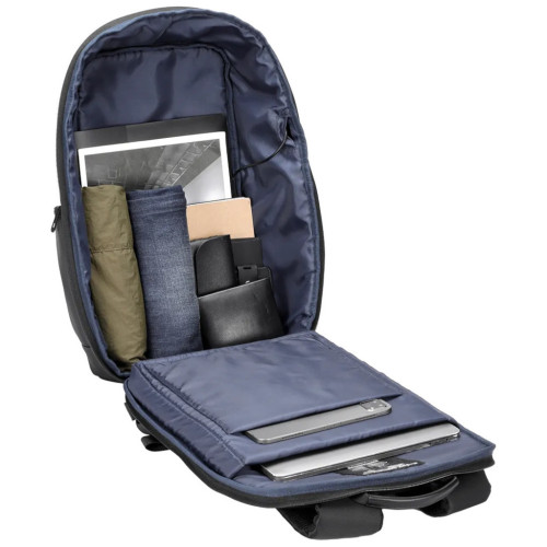 Рюкзак виготовлений з міцного матеріалу — поліестеру та еко-шкіри. Внутрішня конструкція рюкзака оптимізована для максимальної зручності. Основне відділення має спеціальне відділення для ноутбука розміром 15.6", а також чотири кишені для документів, аксесуарів, блокнотів. Практичний доступ до основного відділення забезпечує оптимальну зручність витягування вмісту.