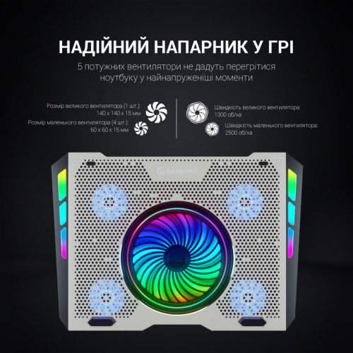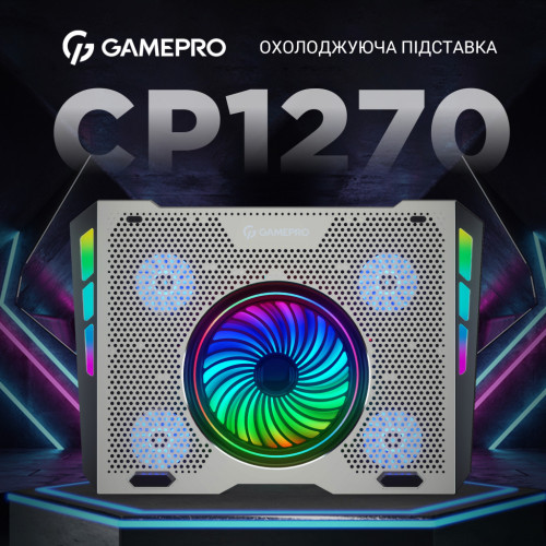 GamePro CP1270 оснащена не одним, а аж п'ятьма потужними вентиляторами, які забезпечують ефективне охолодження вашого ноутбука. Найбільший вентилятор розміром 140х140х15 мм працює на швидкості 1300 обертів в хвилину, забезпечуючи стабільний та ефективний потік повітря. Чотири додаткові вентилятори розміром 60х60х15 мм працюють на вражаючій швидкості 2500 обертів в хвилину, гарантуючи оптимальне охолодження всіх куточків вашого ноутбука.