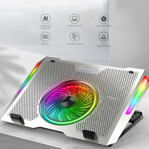 Підставка також має два USB-роз'єми для підключення додаткових пристроїв. Можливість регульованння куту нахилу на 6 рівнів забезпечує оптимальний кут для вашого робочого простору. А RGB-підсвічування, кероване за допомогою спеціальної кнопки, додає не лише стиль, але й можливість налаштовувати атмосферу вашого робочого простору.