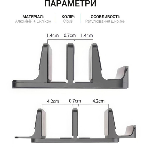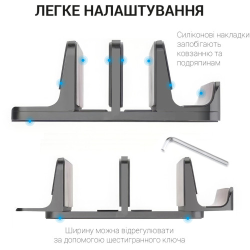 Підставка має подвійний слот, що дозволяє зберігати два ноутбуки одночасно. Це робить її ідеальним інструментом для організації вашого робочого столу, забезпечуючи оптимальний порядок та легкість в роботі.