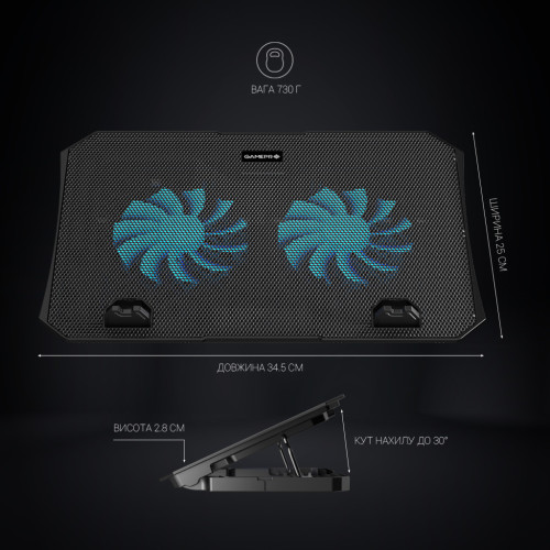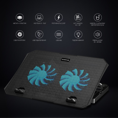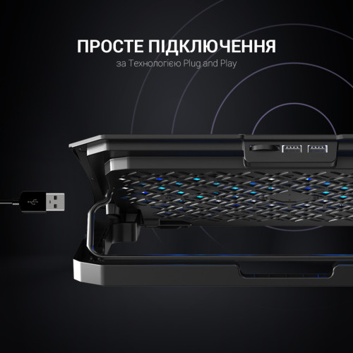 Охолоджувальна підставка GamePro – це поєднання потужної системи охолодження забезпечує максимальне тепловідведення. Залізна сітка + пластиковий матеріал основи міцний та ідеальний у продуктивності розсіювання тепла. Вбудовані ніжки забезпечують розташування ноутбука під зручним кутом, а обмежувачі перешкоджають зісковзуванню. Підсвічування робить підставку не тільки ефективним гаджетом, але й стильним аксесуаром для геймерів. Завдяки підставці GamePro навіть тривалі ігрові баталії проходитимуть у зручності та без пошкодження та перегріву ноутбука. Нехай ваша гра проходить стильно та затишно. У комплекті йде тримач для телефону, який можна легко встановити по обидва боки підставки для максимального комфорту у використанні. Швидкість обертання вентиляторів з підсвічуванням можна відрегулювати або за бажанням вимкнути. Завдяки обмежувачам ноутбук не зісковзуватиме, а за допомогою прогумованих ніжок можна зафіксувати висоту підставки.