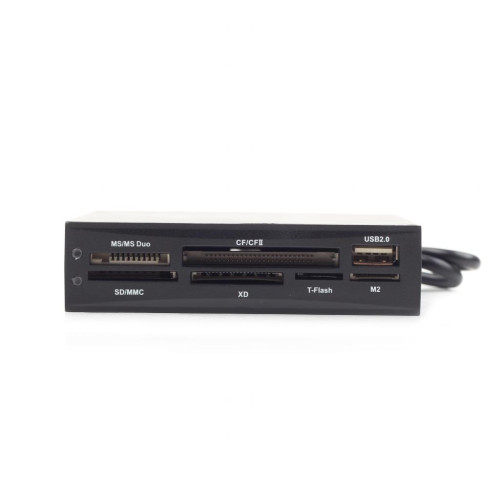 Зчитувач флеш-карт GEMBIRD FDI2-ALLIN1-02-B - це зручний адаптер для підключення до комп'ютера пристроїв з інтерфейсом USB, SATA і карт пам'яті різних типів. Закріплюється на 3.5-дюймовому відсіку системного блоку за допомогою вхідних в комплект поставки гвинтів, підключається до USB-роз'єму на материнській платі вбудованим кабелем. Порт USB 2.0 і слоти для карт пам'яті розташовані на передній панелі адаптера. Слоти оснащені світлодіодною індикацією статусу підключених носіїв.