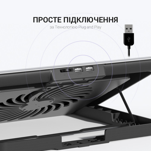 Ця підставка обладнана шістьма великими вентиляторами розміром 60 х 60 х 15 мм, які працюють на вражаючій швидкості 2500 обертів за хвилину. Їхній потужний обіг повітря забезпечує ефективне охолодження вашого ноутбука під час інтенсивної роботи чи гри. Додатковий комфорт надає два вбудовані USB-роз'єми, завдяки яким ви завжди матимете доступ до необхідних пристроїв. З вісьмома налаштовуваними рівнями висоти ви легко знайдете оптимальне положення для вашого ноутбука, щоб забезпечити найзручніше робоче середовище.